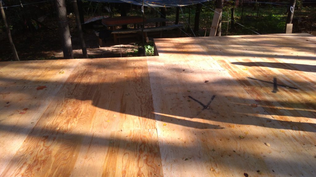 Фанеру крепим на клей и гвозди, клей еще спасает от скрипа.